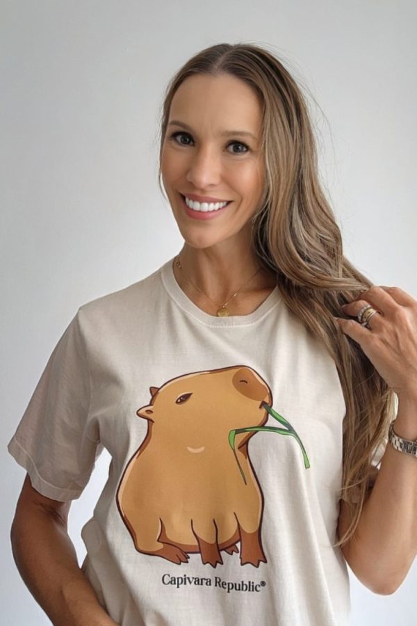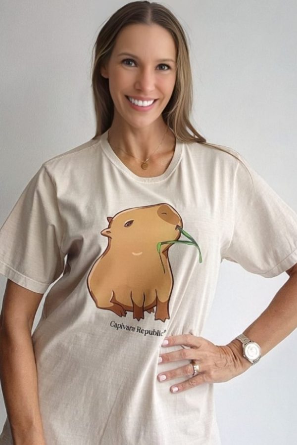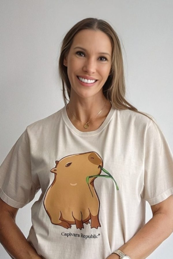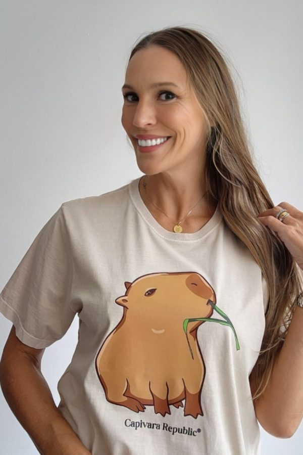 Esta estampa Capi Capim é primeira no nosso best-seller! Tanto adultos, quanto crianças escolhem a Capi Capim para ser sua primeira tee da coleção Capivara Republic!