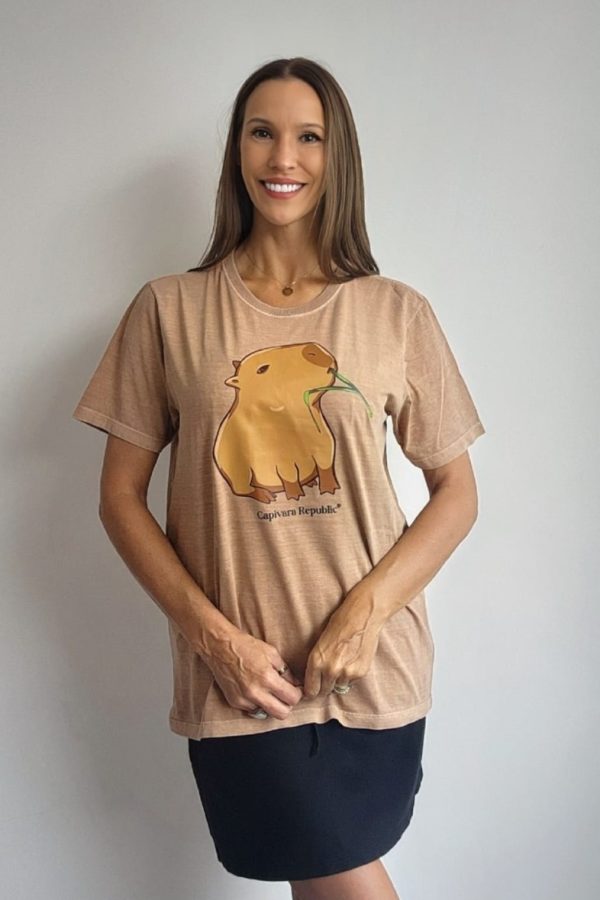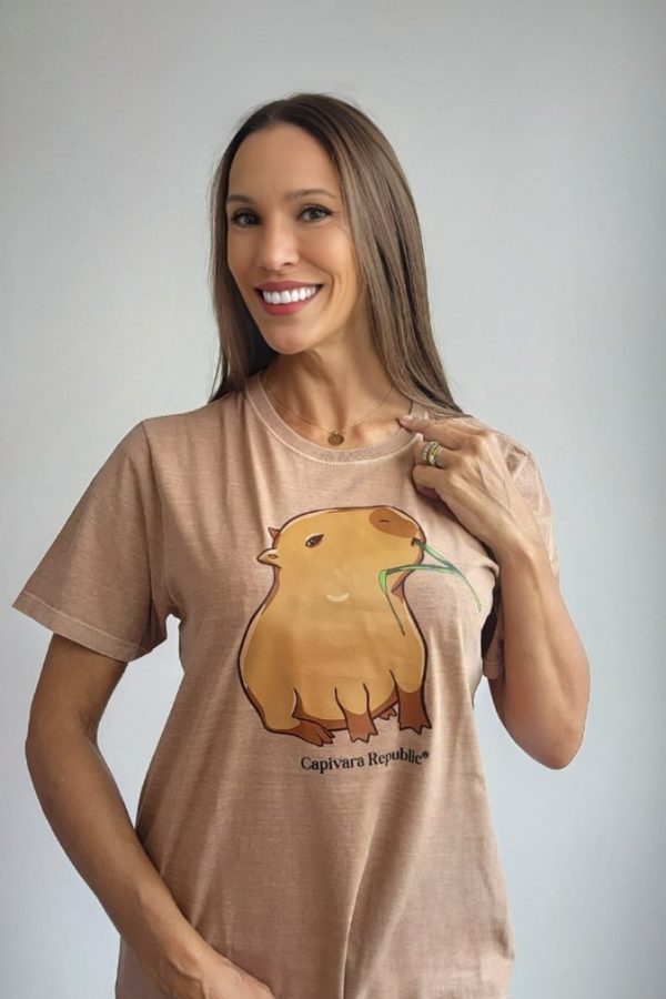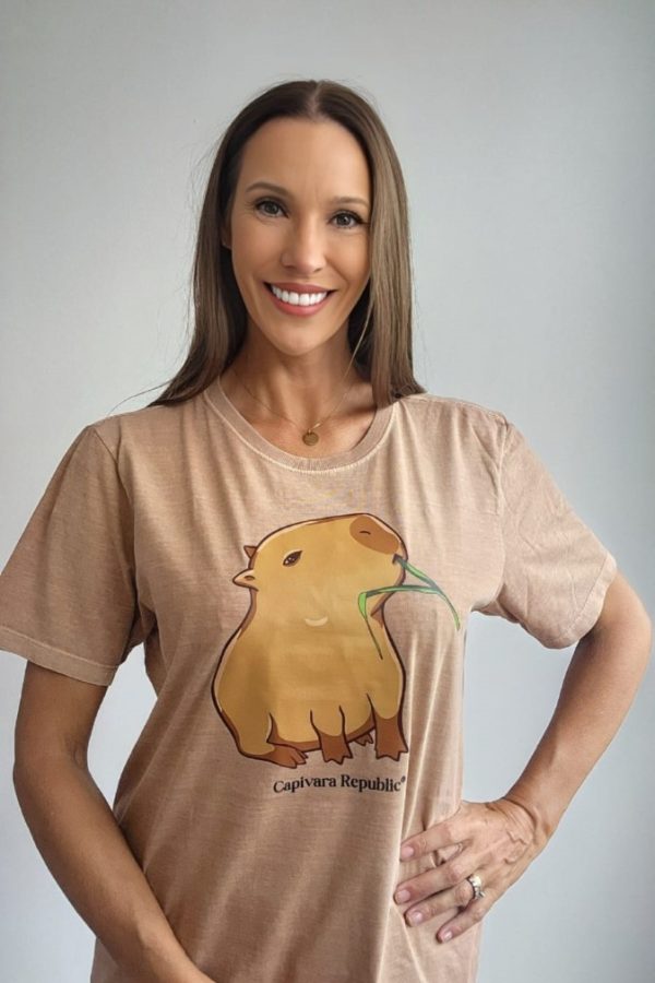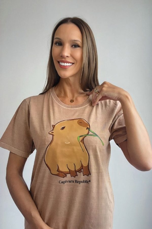 Esta estampa Capi Capim é primeira no nosso best-seller! Tanto adultos, quanto crianças escolhem a Capi Capim para ser sua primeira tee da coleção Capivara Republic!