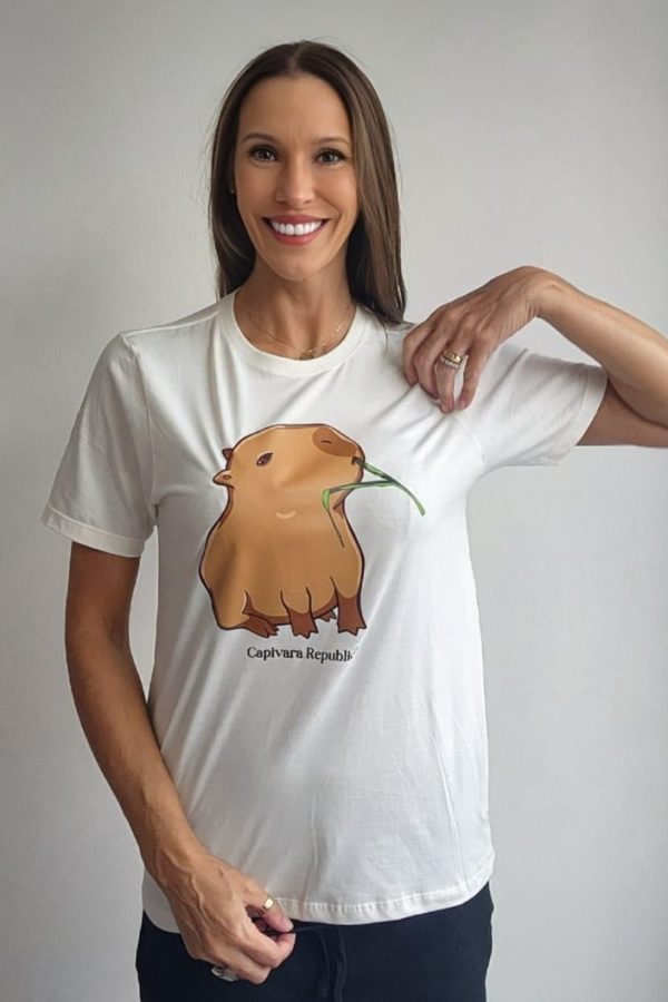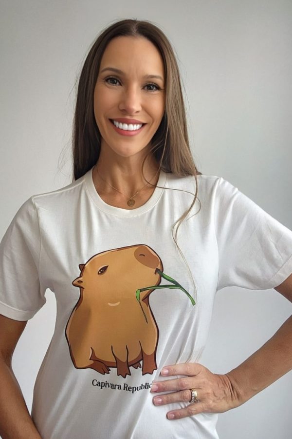 Esta estampa Capi Capim é primeira no nosso best-seller! Tanto adultos, quanto crianças escolhem a Capi Capim para ser sua primeira tee da coleção Capivara Republic!