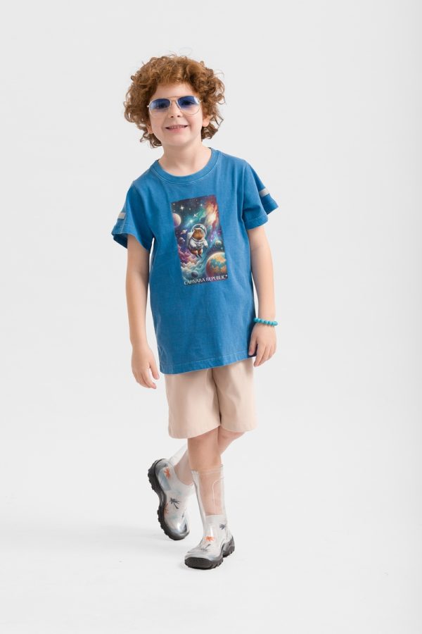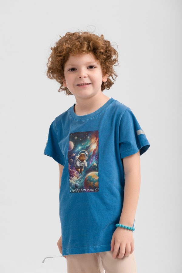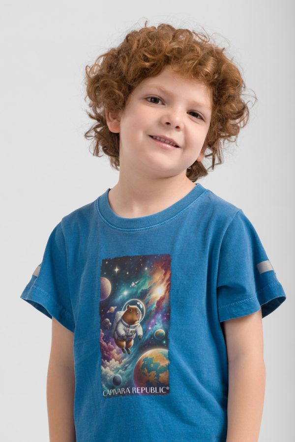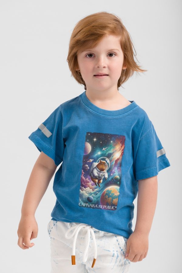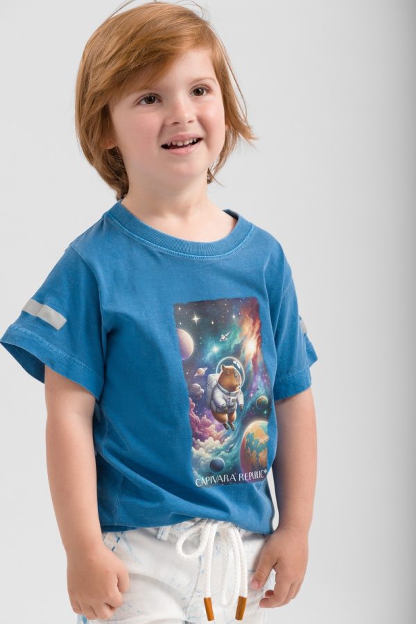 Nossa Capivara está explorando o universo e você pode representá-la com esta linda camiseta estonada! Nas mangas têm faixas refletoras! É uma camiseta muito intergaláctica!